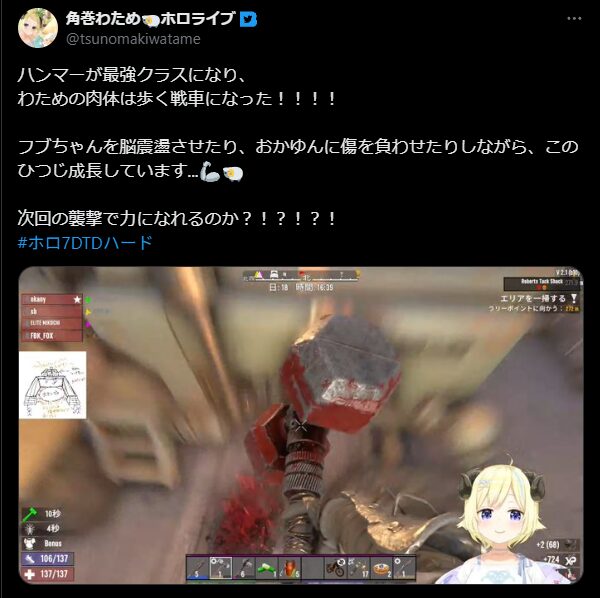 ホロライブ4期生の角巻わためさんが、自身の配信で、先日最終回を迎えた大型ゲーム企画「7Days to Die」を振り返り、感極まって号泣していました。