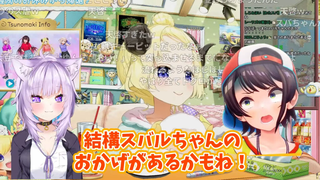 スバルさんのおかげで自分を出せるようになったと語る角巻さんは、「結構スバルちゃんのおかげがあるかもね」と感謝の言葉を口にしました。