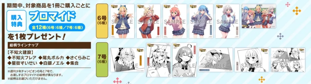6号と7号で異なる6種類のブロマイドが各号について、合計12種類の中からランダムで1枚プレゼントされます。