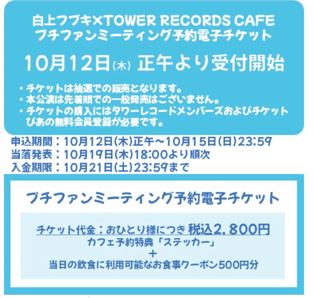 白上フブキのファンミーティングがタワーレコードカフェ渋谷、名古屋、大阪にて開催されます。