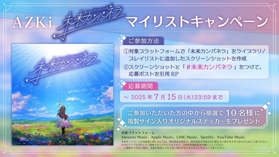 ホロライブ所属のVTuber、AZKiさんの新曲「未来カンパネラ」のリリースを記念して、豪華プレゼントが当たるマイリストキャンペーンが開催されます!