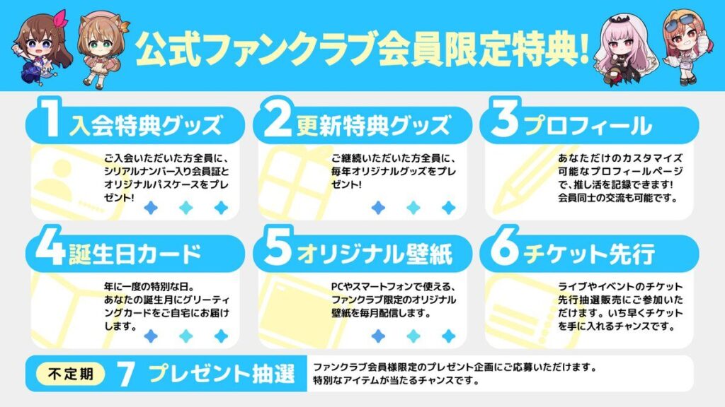 かねてより多くのファンから要望が寄せられていた公式ファンクラブが、ついに実現します。「hololive FANCLUB」では、ファンがホロライブをより身近に感じられるような様々な特典が用意されます。