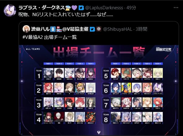 チーム6には、ホロライブX(秘密結社holoX)総帥のラプラス・ダークネスさんが参戦。紡木こかげさん、白雪レイドさん、本間ひまわりさんといった豪華メンバーとの化学反応が注目されます。