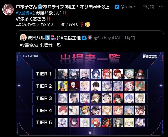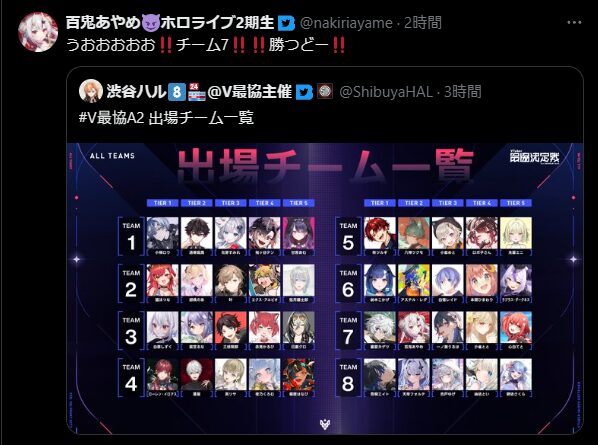 2025年10月24日に出場全8チームが発表され、ホロライブからロボ子さん、ラプラス・ダークネスさん、百鬼あやめさんの計3名が参戦することが明らかになりました。