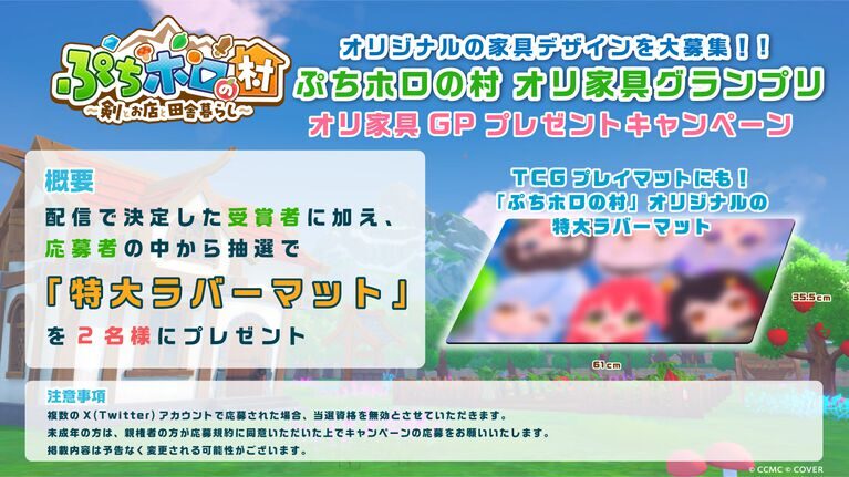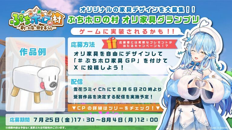 これを記念し、ホロライブ所属VTuber「雪花ラミィ」さんの協力のもと、ユーザーがデザインした家具がゲーム内に登場するチャンスのある特別イベント『ぷちホロの村 オリ家具グランプリ』を開催します。