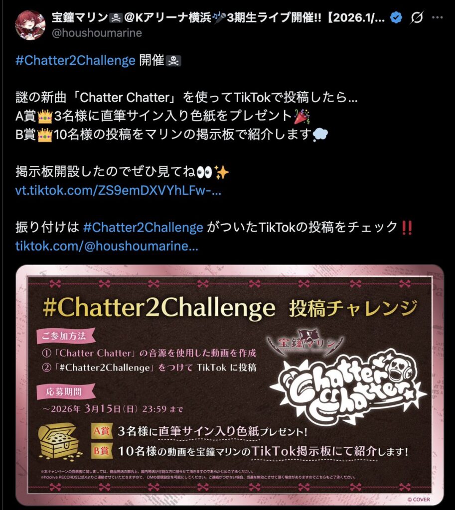 ホロライブ所属のVTuber・宝鐘マリンが、新曲「Chatter Chatter」を使ったTikTok投稿チャレンジ「#Chatter2Challenge」を開催しています。