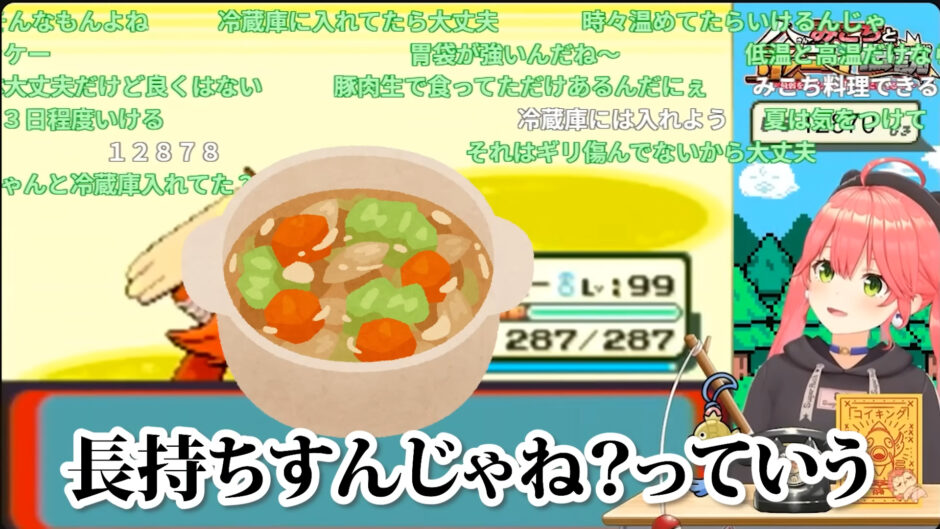 大きな鍋で大量に作ったというポトフに対し、リスナーからは保存状態を心配する声が。さくらみこさんは「ある程度ちょいちょい火をさ、入れてたらさ、長持ちすんじゃね」と“みこ理論”を展開しました。