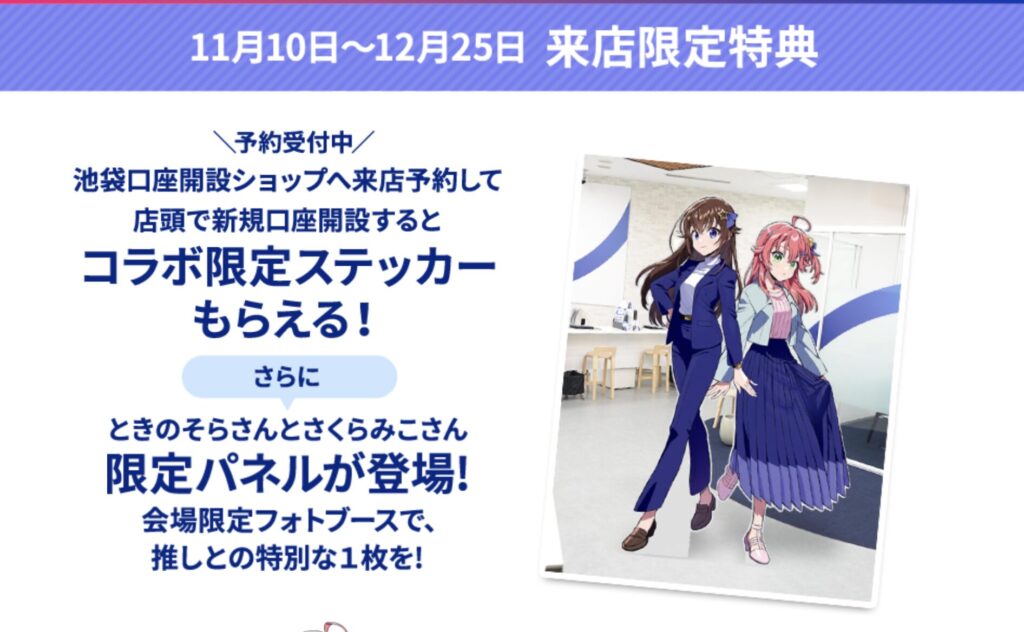 どちらかが全員にプレゼントされます。さらに、池袋口座開設ショップ限定で、来店予約と口座開設を行った先着350名に「コラボ限定ステッカー」が配布される施策も明らかになりました。