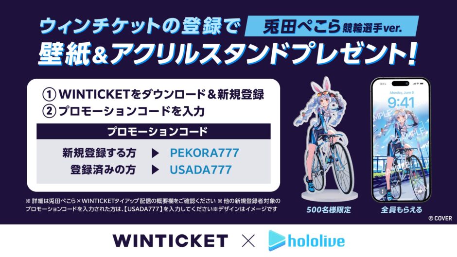 WINTICKETに新規登録し、指定のプロモーションコードを入力した方全員に、「兎田ぺこら 競輪選手ver. オリジナル壁紙」がプレゼントされます。