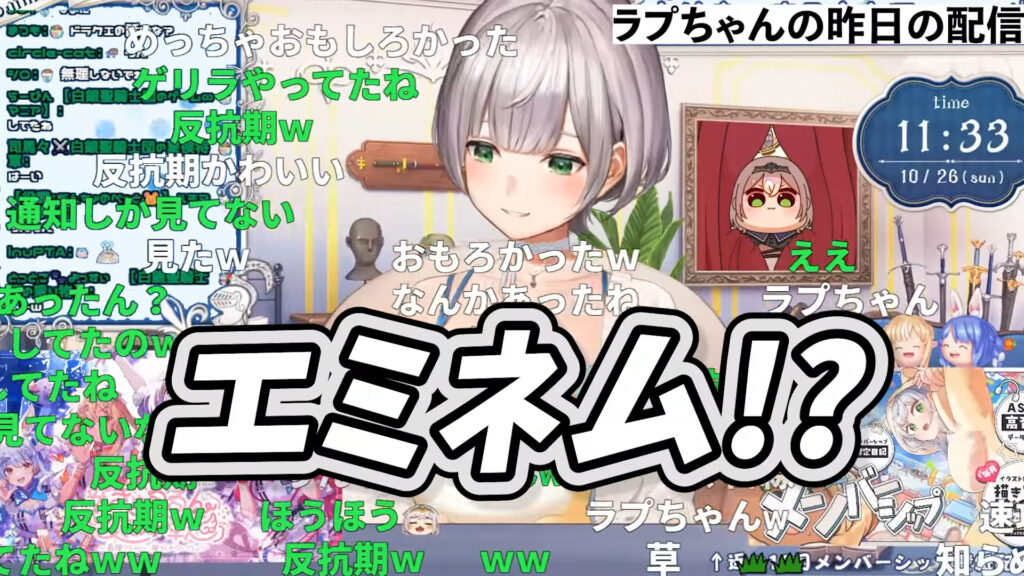 今回の話題は、配信の雑談パートで飛び出しました。ノエルさんは前日に行われた後輩・ラプラス・ダークネスさんの「愚痴エミネム配信」というタイトルを見た際の心境を語り始めました。