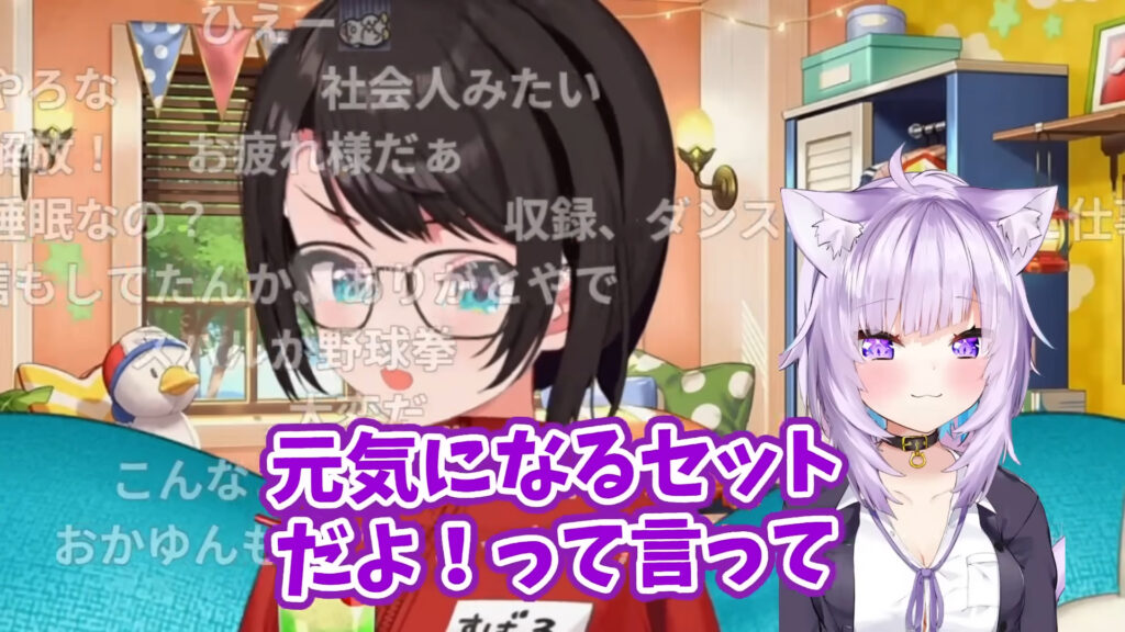 猫又おかゆさんとはよく作業通話をしているそうですが、スバルさんがあまりにも大変そうな様子だったためか、おかゆさんが「元気になるセットだよ」とお土産を買ってきてくれたと明かしました。