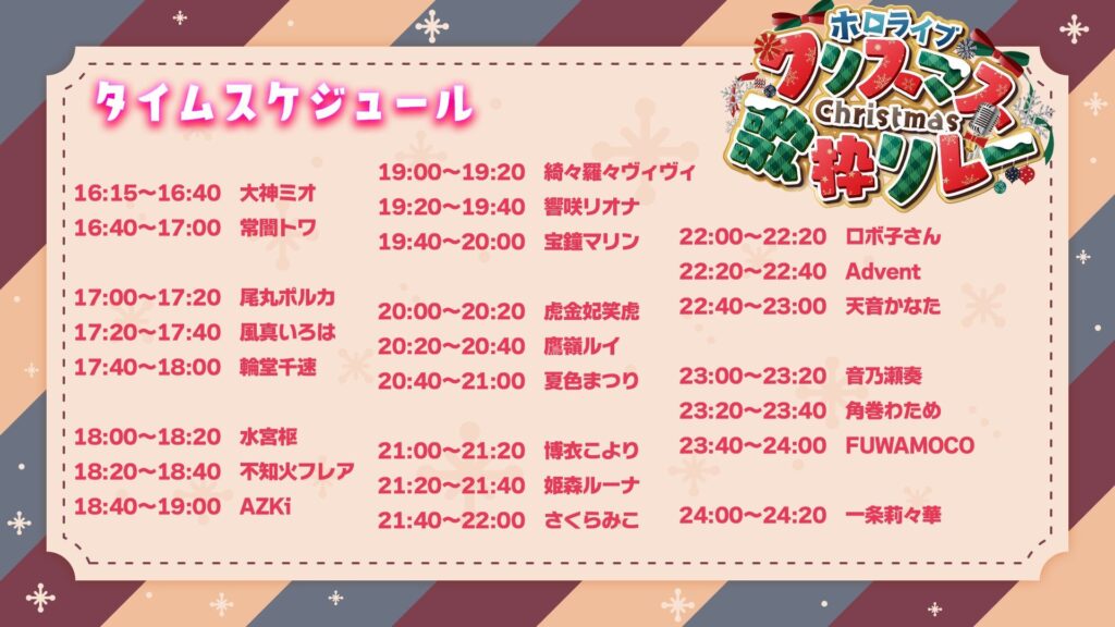 - イベント名:ホロライブ クリスマス歌枠リレー