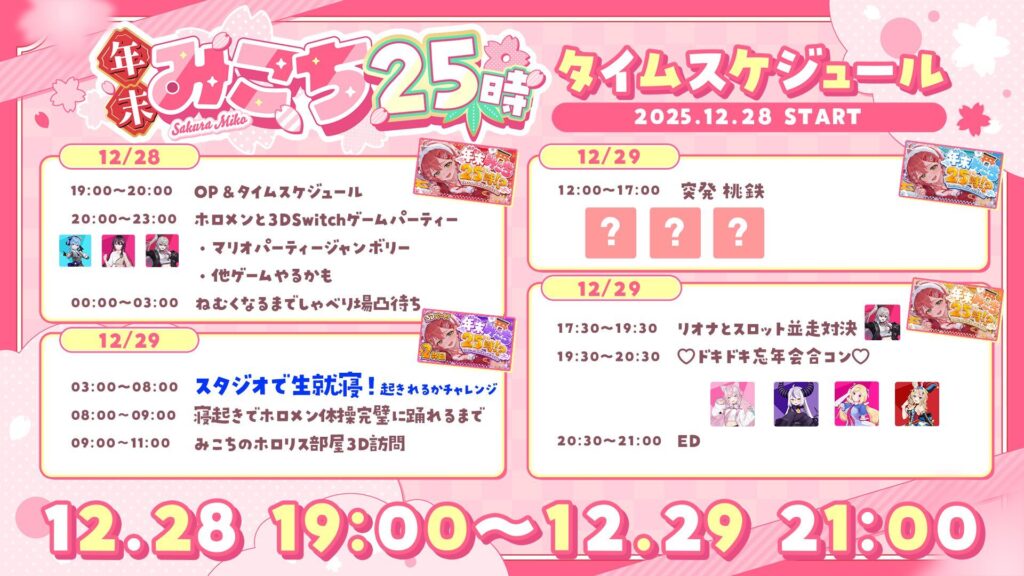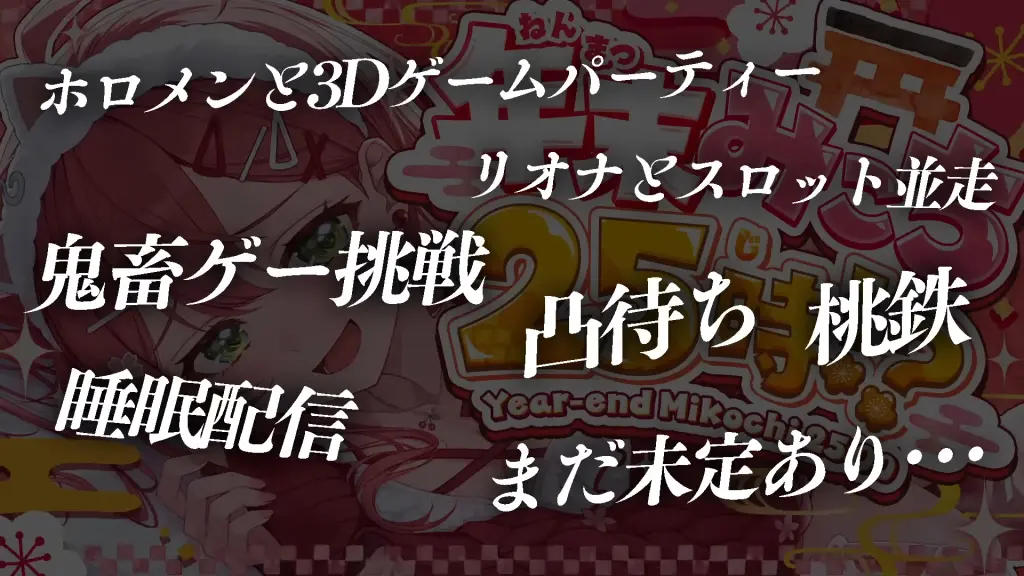 現時点では「鬼畜ゲー挑戦」や「凸待ち」、「桃鉄」といったコーナーがリストアップされていますが、まだ「未定」となっている枠も残されています。詳細なタイムスケジュールについては、12月28日20時から行われるオープニング配信の中で正式に公開されるとのことです。