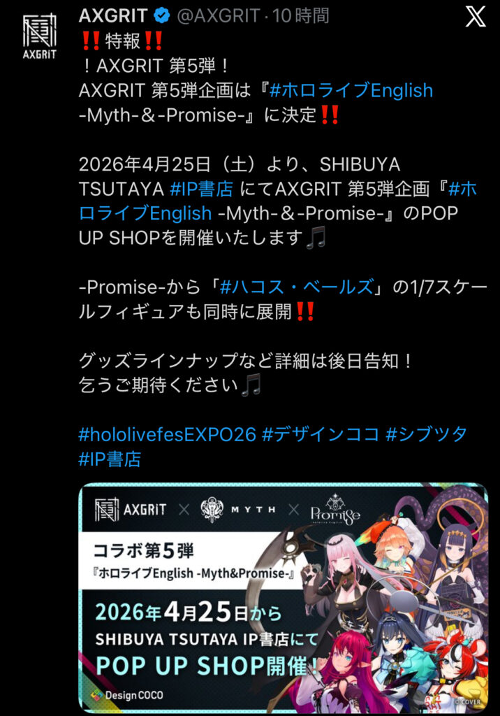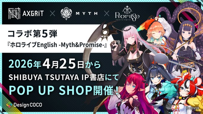デザインココとSHIBUYA TSUTAYA IP書店による共同ブランド「AXGRIT(アクスグリット)」の第5弾企画が、「ホロライブEnglish -Myth- & -Promise-」に決まりました。