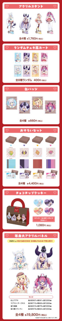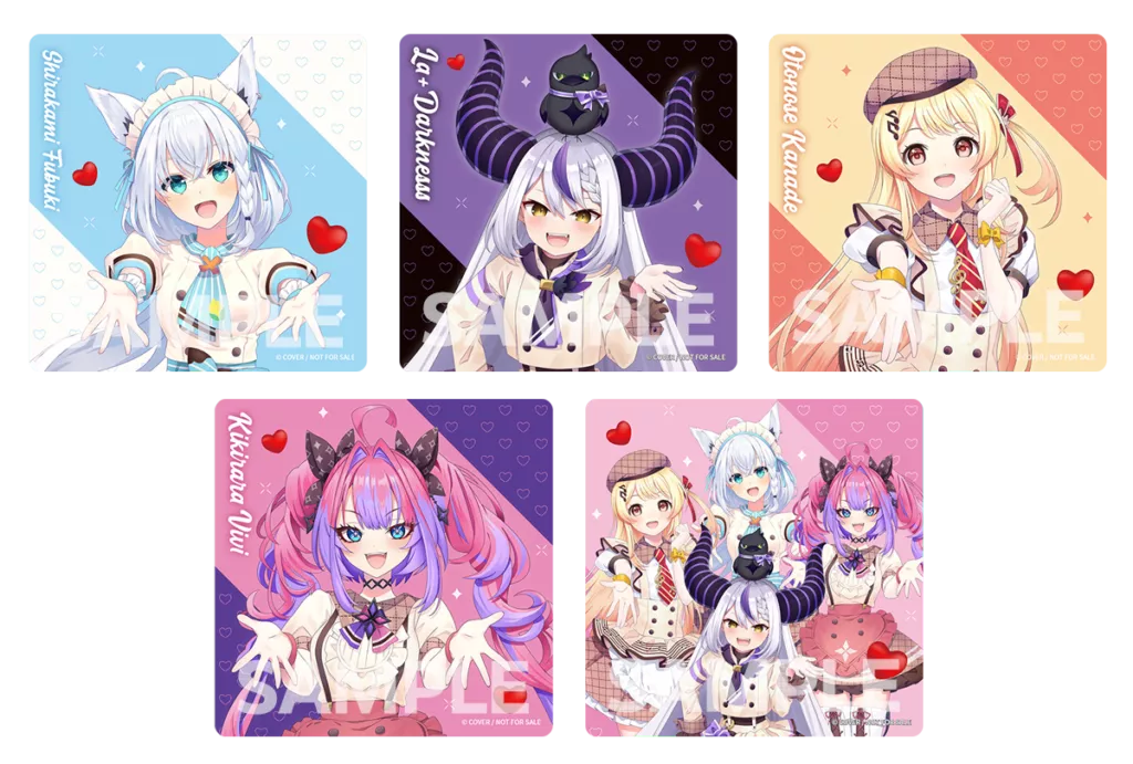 今回は「白上フブキ」「ラプラス・ダークネス」「音乃瀬奏」「綺々羅々ヴィヴィ」の4名が参加。バレンタインをテーマにした描き下ろしイラストによるグッズ販売に加え、HMV&BOOKS SHIBUYAでのポップアップショップ、そして全国のHMV店舗での特典配布フェアが実施されます。
