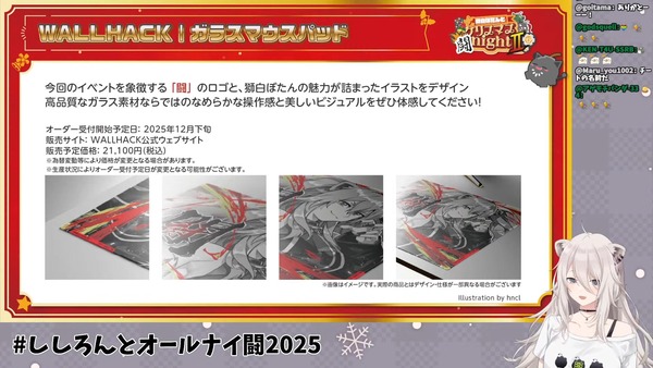 本イベントの開催を記念し、「WALLHACK」ブランドよりコラボガラスマウスパッドの発売が決定しました。イベントを象徴する「闇」のロゴと、イラストレーターhncl氏による獅白ぼたんのイラストがデザインされた高品質なガラス製マウスパッドです。