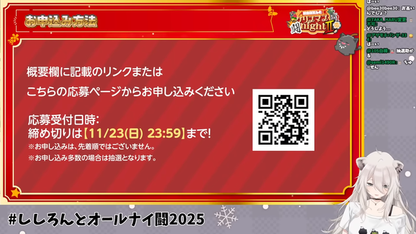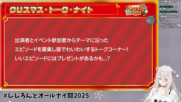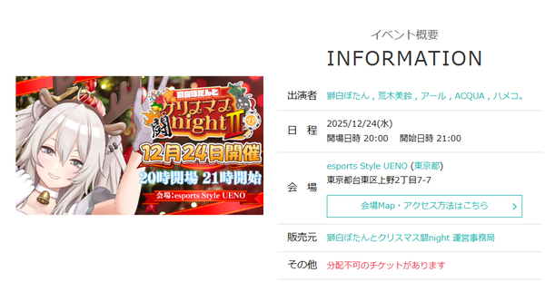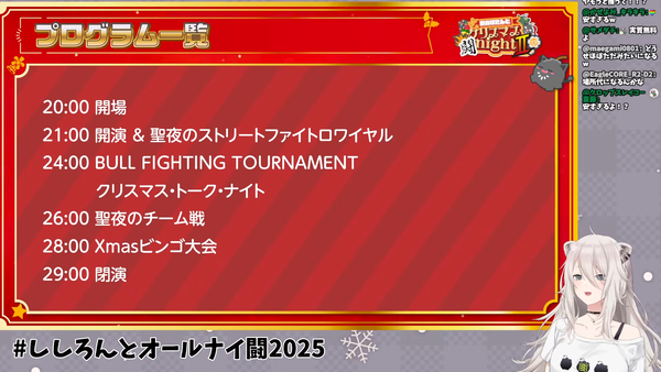 本イベントは、獅白ぼたんさんと共に、格闘ゲームやトーク、ビンゴ大会などを通じてクリスマス・イブの夜を過ごす企画です。