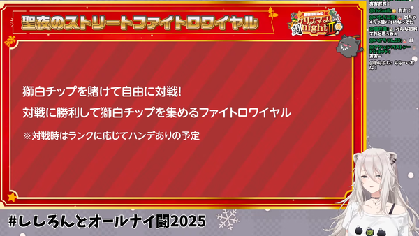 - 聖夜のストリートファイトロワイヤル: イベント内通貨「獅白チップ」を賭けて自由に対戦するファイトロワイヤル形式。勝利してチップを集めます。対戦時にはランクに応じたハンデが設けられる予定です。