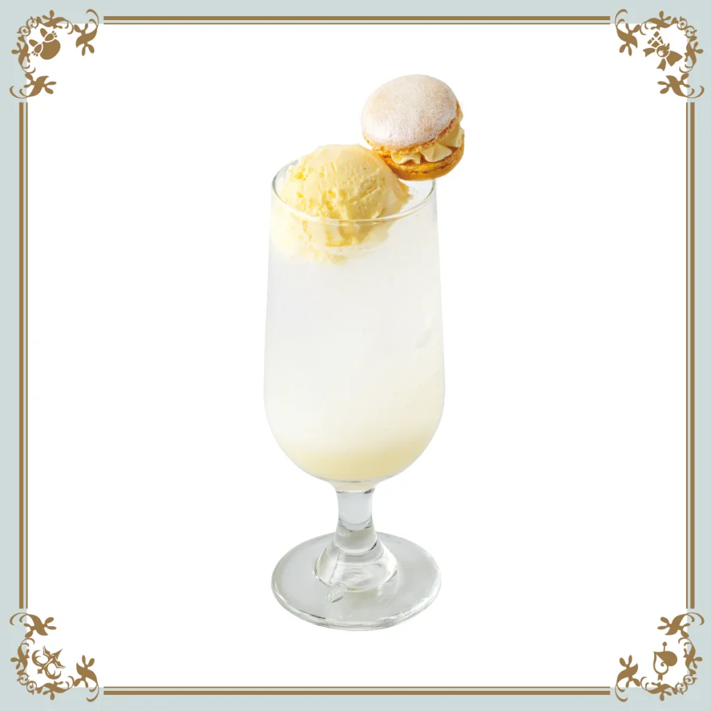 価格:990円(税込1,089円) ホワイトソーダにバニラアイスを合わせ、白銀ノエルをイメージしたマカロンをトッピングしています。見た目も味も癒やし系なドリンクです。