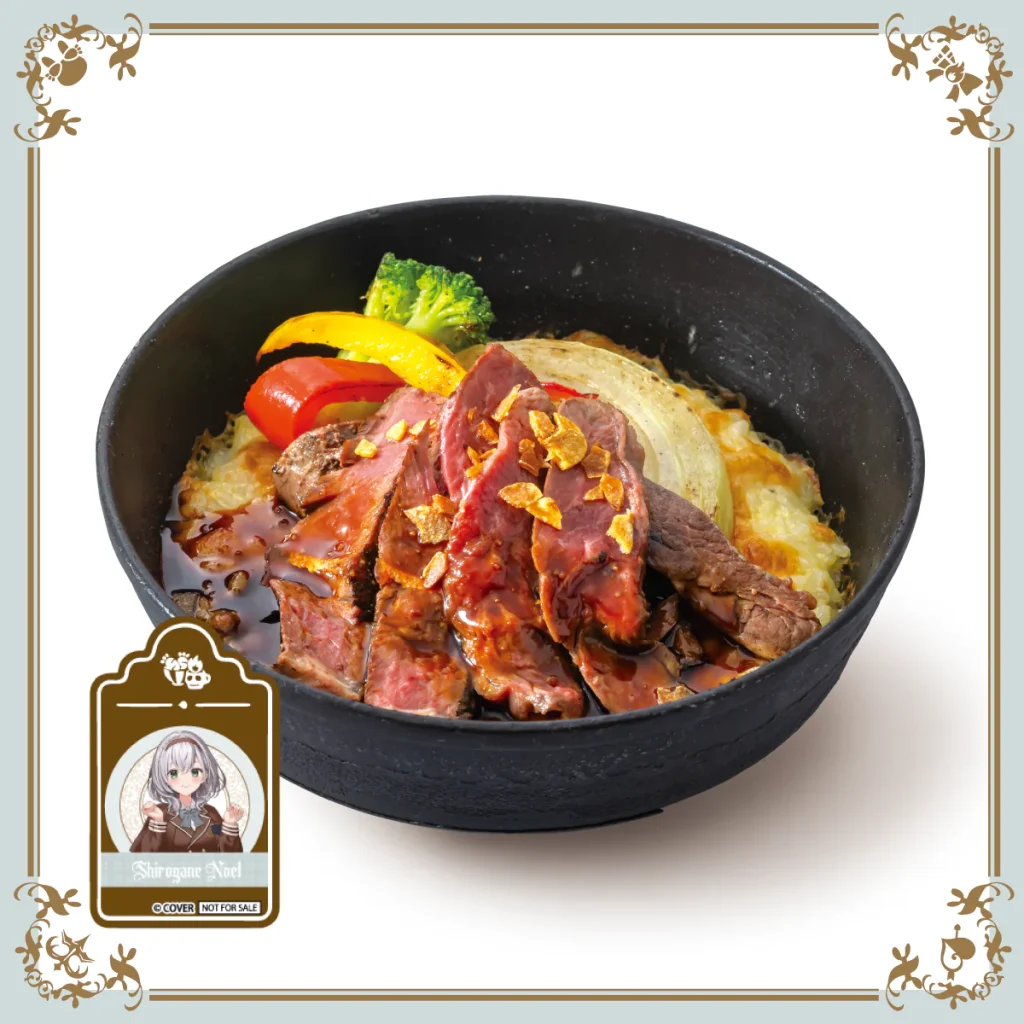 価格:2,190円(税込2,409円) お肉好きな白銀ノエルらしい、ボリューム満点のメニューです。柔らかなサガリ肉のステーキを豪快に乗せ、ガーリック香る醤油ソースで仕上げています。