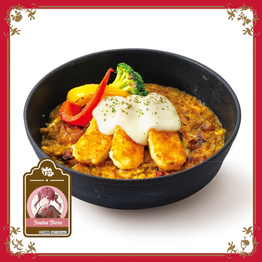 価格:1,890円(税込2,079円) カレーとハッシュドポテトをベースに、宝鐘マリンの好物を詰め込んだドリアです。たっぷりのモッツァレラチーズが絡み合う、濃厚な味わいが魅力です。