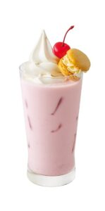価格:990円(税込1,089円) 「ふぁんたじあ」の名の通り、華やかなピンク色が特徴のいちごミルクです。ソフトクリームとマカロンがトッピングされており、デザート感覚で楽しめる一杯となっています。