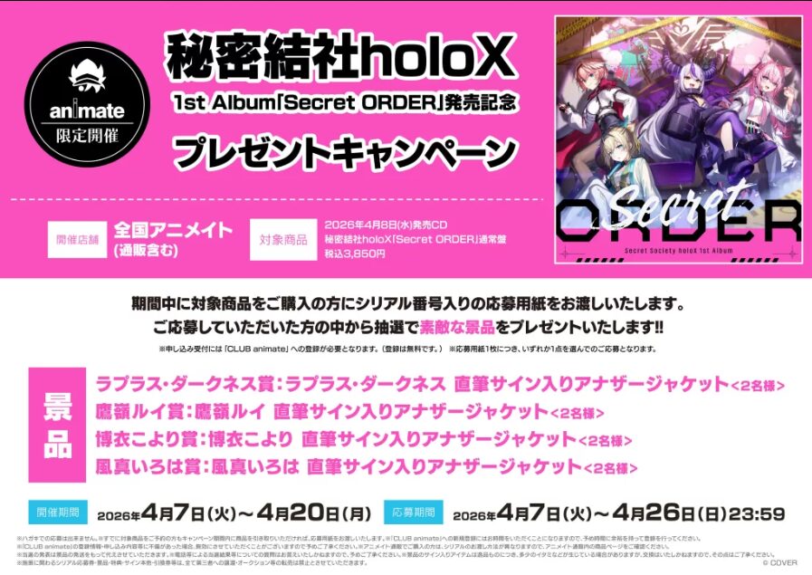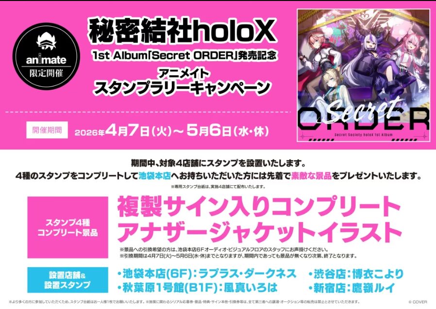 2026年4月7日から5月6日までの期間中、指定の店舗にholoXメンバーの限定スタンプが設置されます。4種類すべてのスタンプを集めてアニメイト池袋本店へ持ち込むと、先着で「複製サイン入りコンプリートアナザージャケットイラスト」がプレゼントされます。
