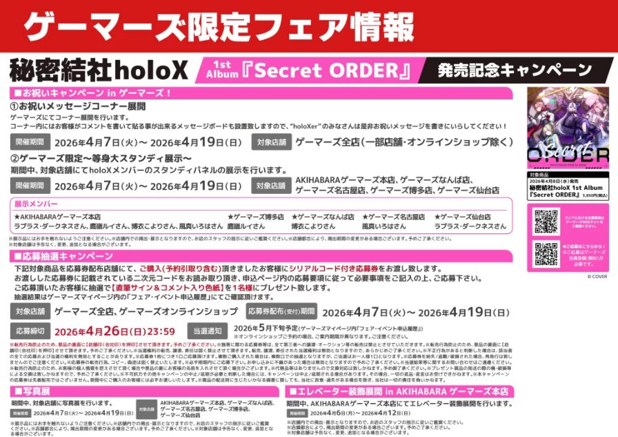 全国のHMV店舗(一部除く)にて、「秘密結社holoX×the virtual master」のコラボポスターが掲出されます。また、HMVまたはHMV&BOOKS onlineでのアルバム購入者を対象に、抽選で5名の方へサイン入りの同ポスターが当たるキャンペーンも実施されます。