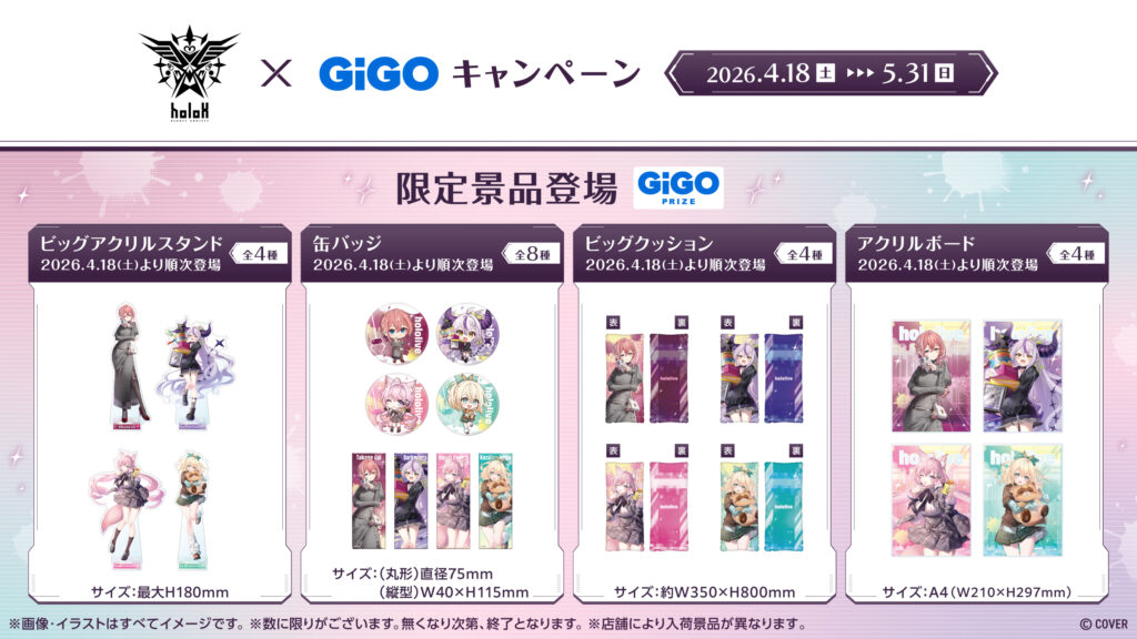 カバー株式会社が運営するVTuberグループ「ホロライブ」のユニット「秘密結社holoX」と、GENDA GiGO Entertainmentのコラボキャンペーンが2026年4月18日(土)から始まります。開催期間は5月31日(日)まで、全国のGiGOグループ店舗およびオンラインクレーンゲーム「GiGO ONLINE CRANE」が対象です。