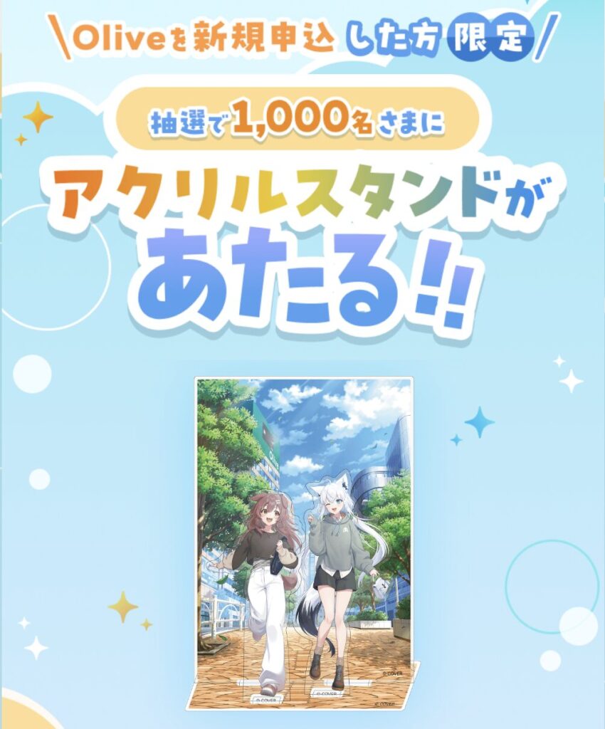 これからOliveのアカウントを新規で作成する方には、一番の目玉である**「オリジナルアクリルスタンド」**が抽選で1,000名に当たります。
