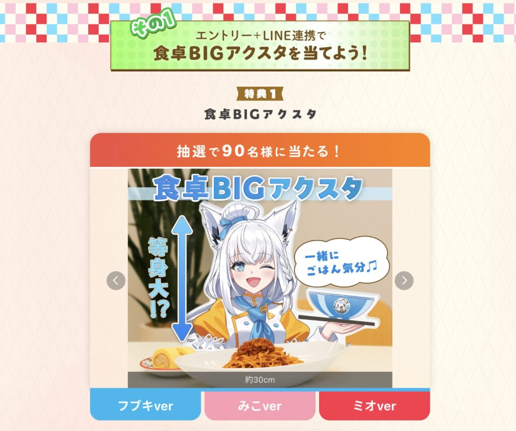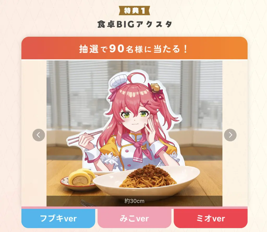 - 抽選で当たる:食卓BIGアクスタ(各30名、合計90名)