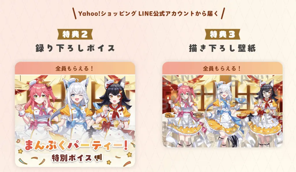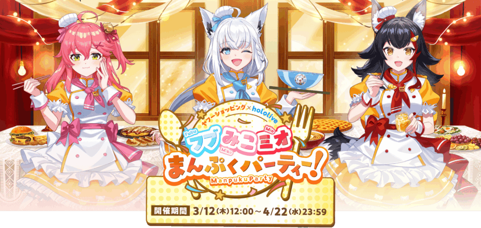 Yahoo!ショッピングにて、ホロライブの白上フブキさん、さくらみこさん、大神ミオさんが登場する「フブみこミオ まんぷくパーティー!」キャンペーンが始まりました。