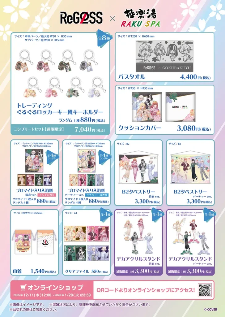 また、店舗では等身アクリルスタンド、バスタオル、巾着などのオリジナルグッズを展開。これらの商品はイベント初日の12月11日12時より、極楽湯公式オンラインショップでも取り扱いが開始されます。