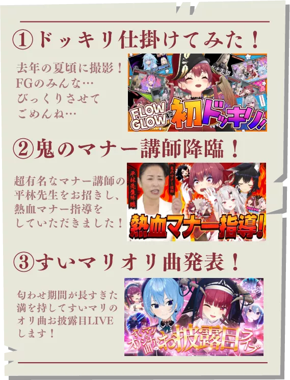 昨夏(2025年夏)に撮影済みの映像で、ホロライブDEV_IS傘下の後輩ユニット・FLOW GLOW(フロウグロウ)のメンバーたちを対象に仕掛けたドッキリが初公開されます。FLOWGLOWは「FG」とも呼ばれる5人組のVTuberグループで、マリン本人は「びっくりさせてごめんね」とコメントしています。