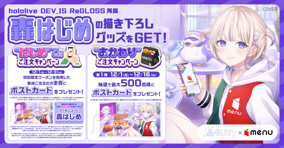 フードデリバリーサービスのmenuが、VTuberグループ「hololive DEV_IS ReGLOSS」に所属する轟はじめとの初コラボキャンペーンを12月1日から開始しました。今回のコラボでは、初めてmenuを利用する人向けと既存ユーザー向けの2種類のキャンペーンが用意されています。