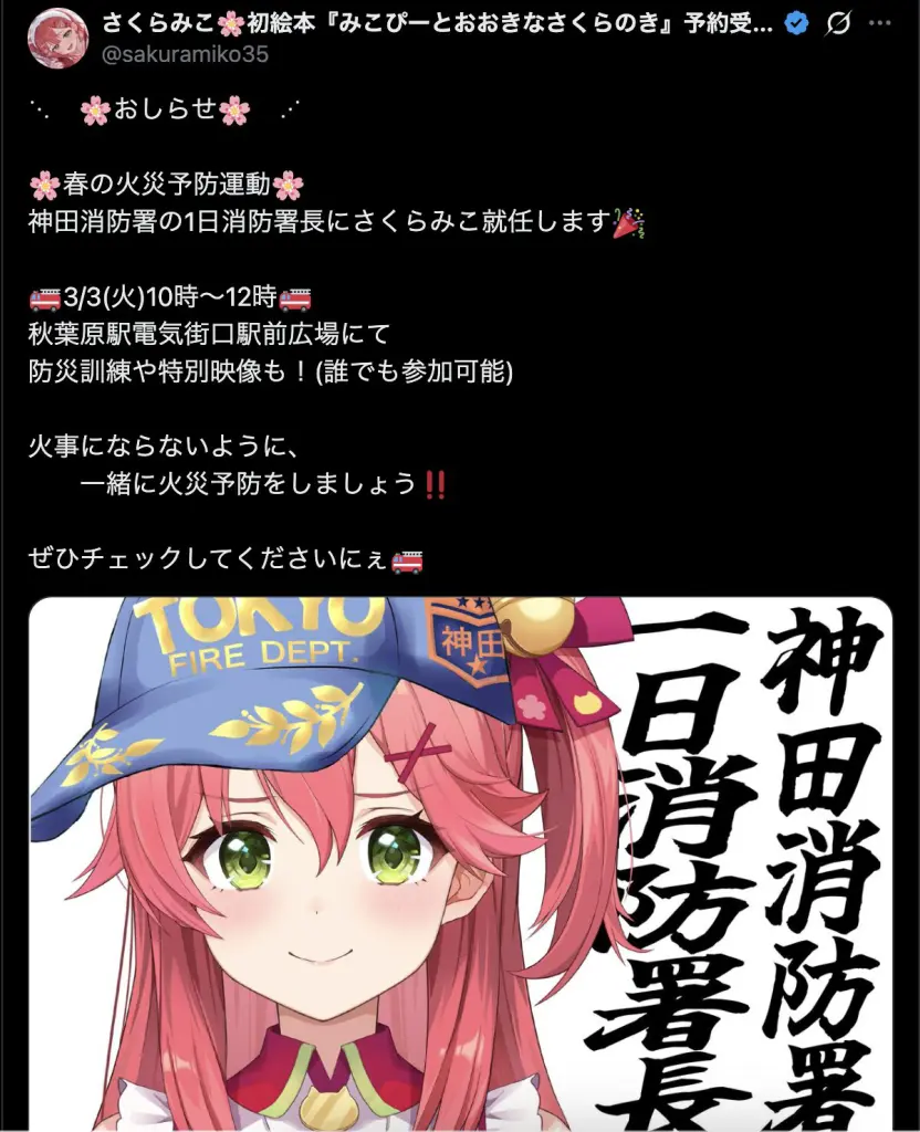 2026年の「春の火災予防運動」の一環として、ホロライブ所属の人気VTuberであるさくらみこさんが、神田消防署の一日消防署長に就任することが決定しました。