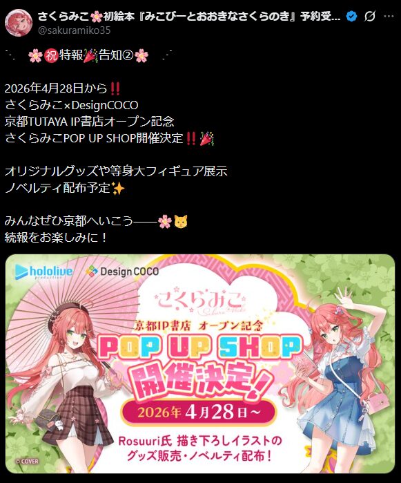 今回のポップアップは、そのオープンを記念した企画として開催され、ホロライブの「エリート巫女」こと、さくらみこをフィーチャーした内容になっています。