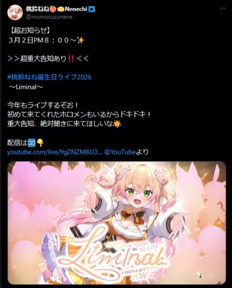 ホロライブ5期生の桃鈴ねねさんが、自身の公式X(旧Twitter)にて、2026年の誕生日を記念したライブ配信「桃鈴ねね誕生日ライブ2026 ~Liminal~」の開催を発表しました。
