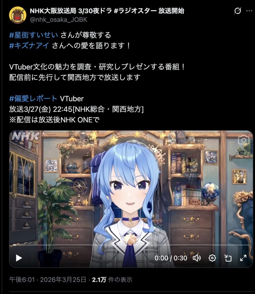 星街すいせいはすでにNHKとの縁が深く、2023年4月からNHK-FMでVTuberをメインに据えた初のラジオ番組『ぶいあーる!〜VTuberの音楽Radio〜』のパーソナリティを務めており、現在はNHKラジオ第1に移行して放送が続いています。