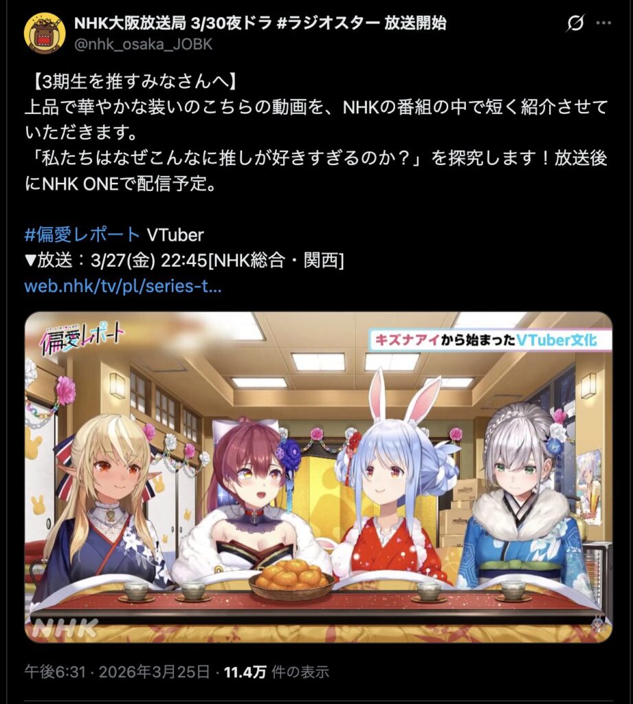 NHK大阪放送局が、バーチャルYouTuber文化をテーマにした番組『わたしの「好き♡」を研究!偏愛レポート ~VTuber編~』を、本日3月27日(金)22時45分よりNHK総合(関西地方)で放送する。