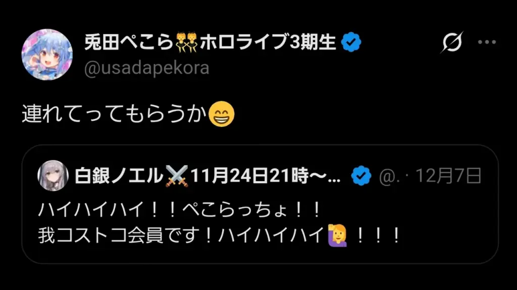 この募集に対し、白銀ノエルさんが素早く反応。Xで手を上げたことで、念願の「ぺこらとのコストコ同行」のチャンスを掴みました。