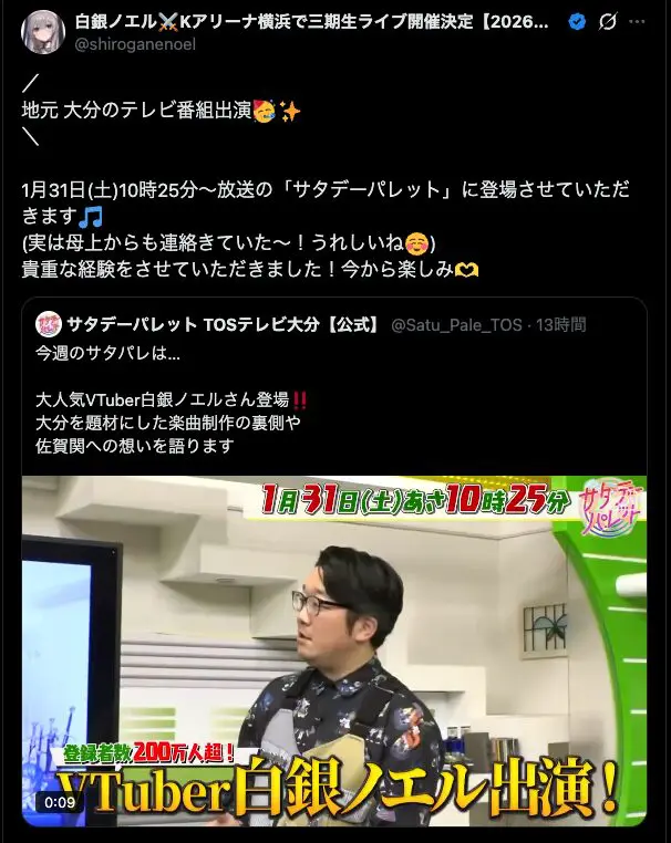 ホロライブ所属の人気VTuber、白銀ノエルが大分県のローカルテレビ番組に出演することが明らかになりました。自身のXにて、地元である大分県の放送局・TOSテレビ大分の情報番組「サタデーパレット」への登場を報告しています。