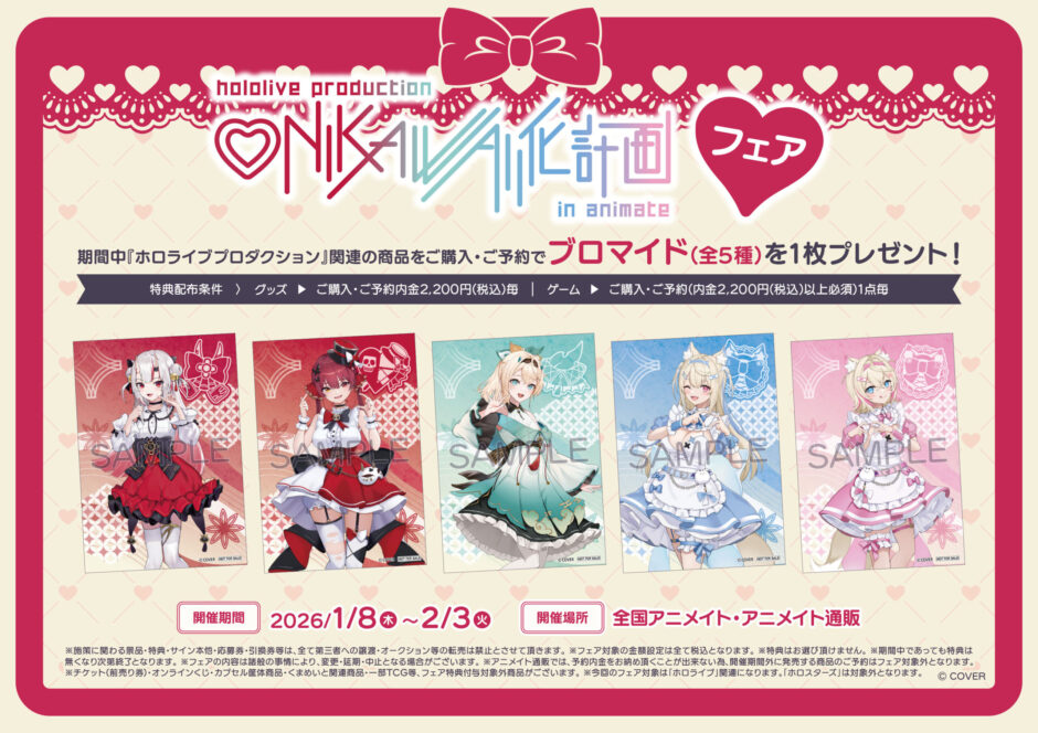 ホロライブプロダクションとアニメイトのコラボレーション企画「ONIKAWAII化計画 in animate」が、2026年1月8日より全国のアニメイトで開催されます。