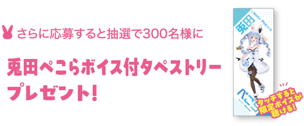 購入後にキャンペーン特設サイトから応募すると、抽選で300名に「兎田ぺこらボイス付タペストリー」が当たります。このタペストリーは「タッチすると限定ボイスが聴ける」仕様で、ファンには嬉しいアイテムです。