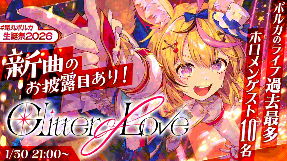 今回の生誕祭ライブのタイトルは「Glitter of Love」。 開催日時は、尾丸ポルカの誕生日にあたる2026年1月30日(金)の21:00からとなっています。
