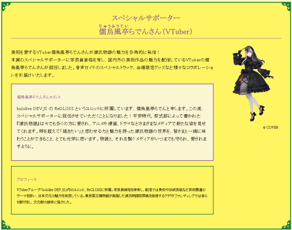 特別展「源氏物語 王朝のかがやき」の公式Xアカウントが、ホロライブ所属VTuber・儒烏風亭らでんさんのスペシャルサポーター就任を発表し、話題になっています。