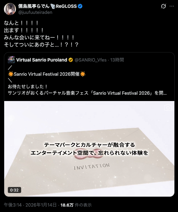 サンリオが主催する世界最大級のバーチャルイベント「Sanrio Virtual Festival 2026」に、hololive DEV_IS ReGLOSSの儒烏風亭らでんさんが出演します。