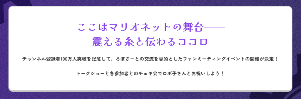 今回のイベントは、ロボ子さんのチャンネル登録者100万人突破を記念し、「ろぼさーとの交流を目的とした」ファンミーティングとして開催されます。