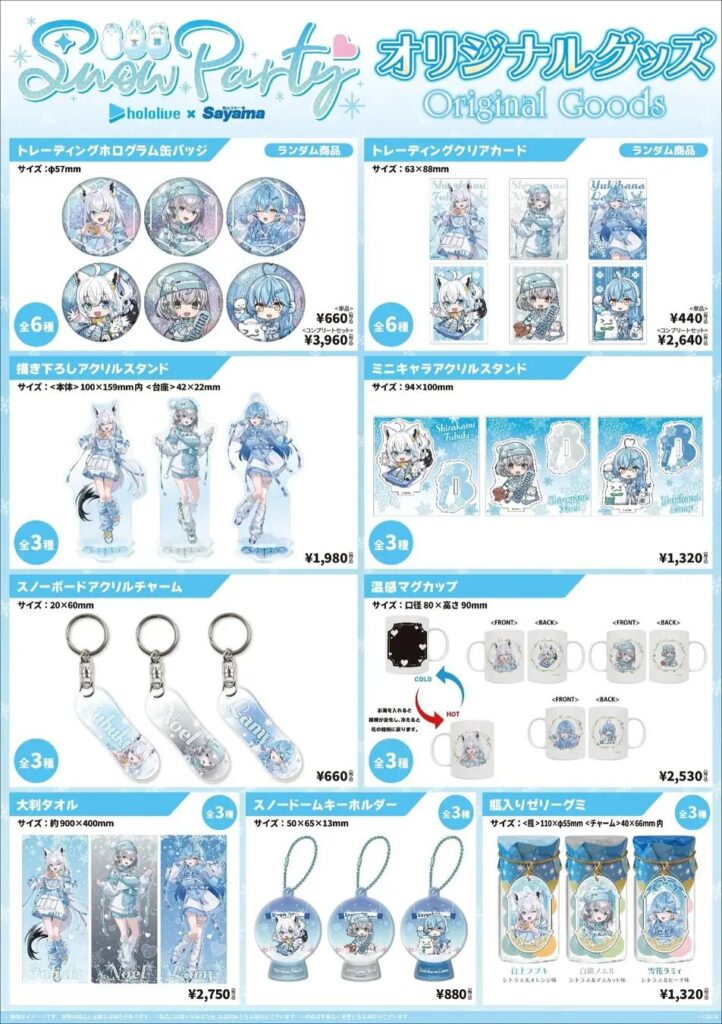 狭山スキー場をイメージした描き下ろしイラストを使用したグッズが販売されます。ラインナップにはアクリルスタンド、缶バッジ、大判タオル、温感マグカップなどが含まれています。